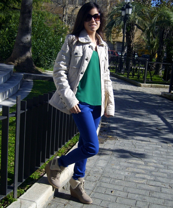 Hoy os traigo un look con una combinacion de colores que a priori nunca habria pensado, pero mi madre me convencio porque a ella le encanta y le recordaba mucho a su juventud, asi que decidi lanzarme a la aventura jaja. De dentro hacia afuera, la blusita verde es una de mis ultimas adquisiones, me parece ideal la caida que tiene y sobre todo el detalle de las mangas amplias, fijaos ahora. Como es finita, opté por mi chaquetón gordito en tonos nude, igual que las cuñas de borrego que tan calentitos y comodos son.